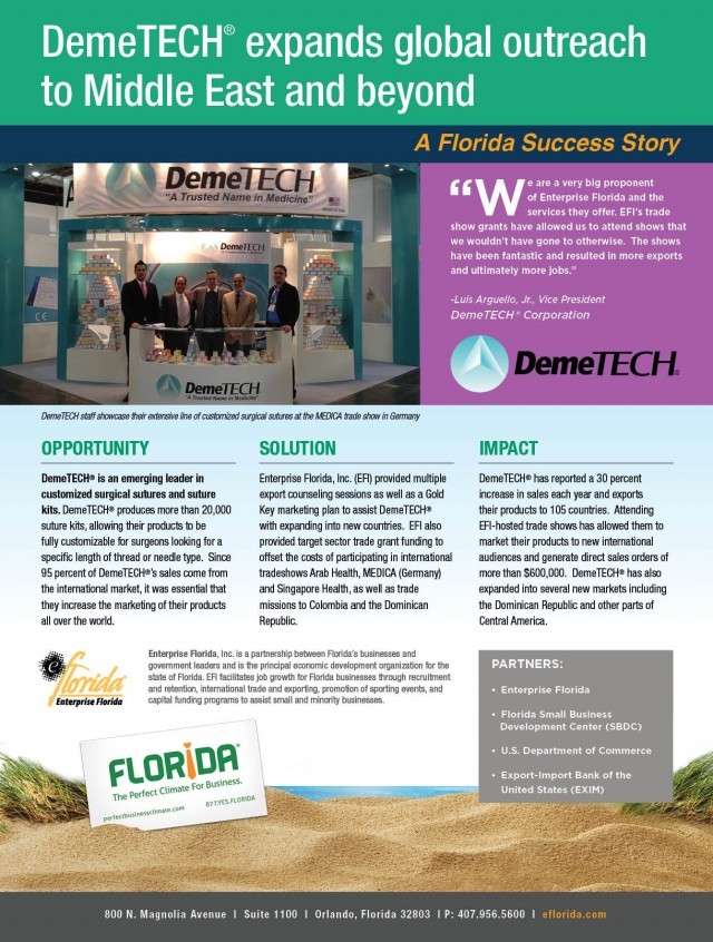 Enterprise Florida,Inc。(EFI)提供多个出口咨询会议以及黄金重点营销计划,以帮助Demetech®扩展到新国家。EFI还提供了目标部门贸易赠送资金,以抵消参加国际贸易商阿拉伯卫生,Medica(德国)和新加坡健康的费用,以及哥伦比亚和多米尼加共和国的交易代表团。
