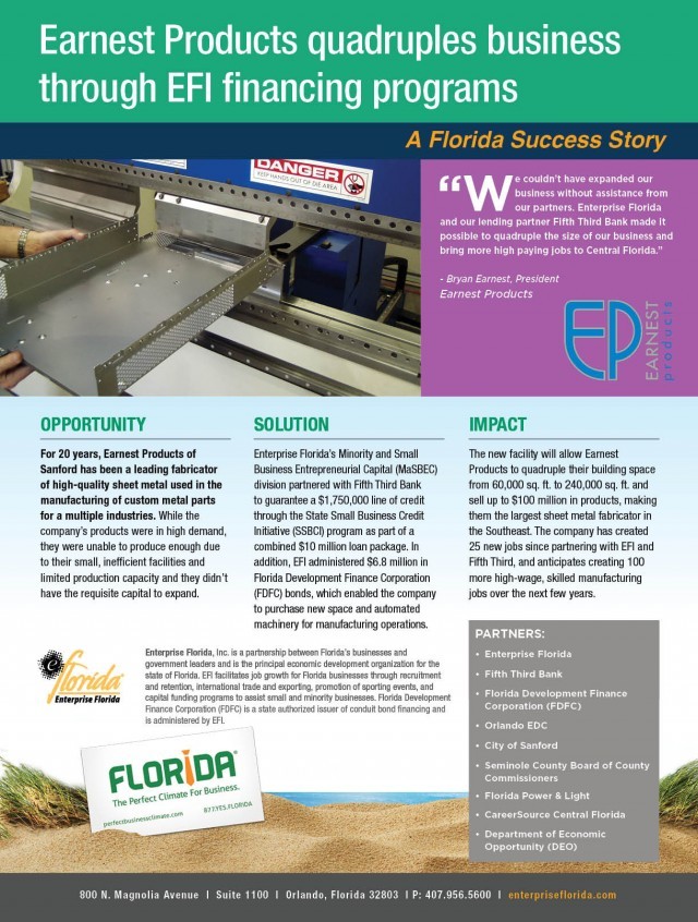 企业佛罗里达州的少数民族和小企业创业资本(MaSBEC)部门与第五第三银行合作,通过州小企业信贷计划(SSBCI)为1750000美元的信贷额度提供担保,作为1000万美元贷款组合的一部分。此外,EFI还管理了680万美元的佛罗里达发展金融公司(FDFC)债券,使该公司能够购买新的航天和自动化机械用于制造业务。