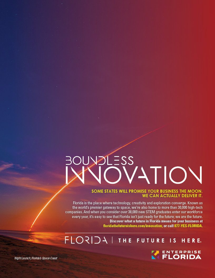 TALLAHASSEE, Fla. (Jan. 29, 2016)– Enterprise Florida (EFI), the principal economic development organization for the state, announced today the launch of a new global branding initiative. The new branding campaign, “Florida – The Future is Here,” targets national and international business decision makers, site consultants and existing Florida business leaders and residents.