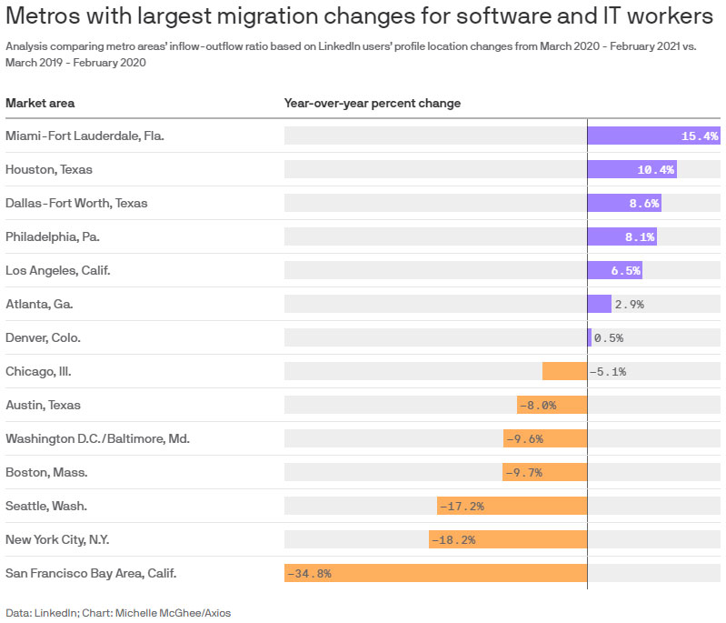 细节:根据LinkedIn的数据,在2020年3月至2021年2月期间,软件和IT服务行业的员工迁入迈阿密、休斯顿、达拉斯、洛杉矶和丹佛的人数超过了前一年。