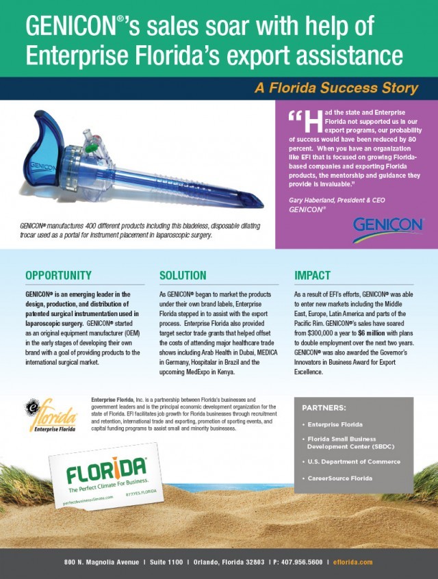 “Had the state and Enterprise Florida not supported us in our export programs, our probability of success would have been reduced by 80 percent. When you have an organization like EFI that is focused on growing Florida-based companies and exporting Florida products, the mentorship and guidance they provide is invaluable.” - Gary Haberland, President & CEO GENICON®