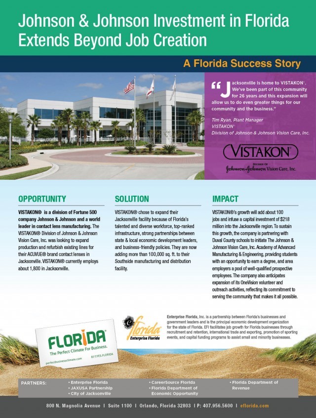 杰克逊维尔的VISTAKON®是财富500强强生公司的一个部门,是隐形眼镜制造业的世界领导者。强生视力保健公司的VISTAKON®部门正在寻求扩大生产并翻新其位于杰克逊维尔的ACUVUE®品牌隐形眼镜的现有生产线。VISTAKON®目前在杰克逊维尔拥有约1800名员工。